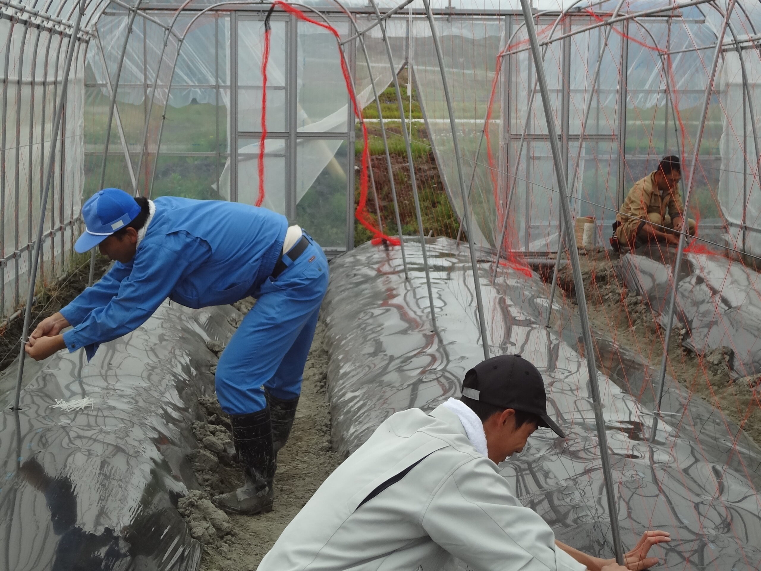 いよいよ来週に迫ったきゅうりの苗の定植に向けて、研修ハウスではその準備に追われていますが、皆さん元気に楽しく作業をしています。