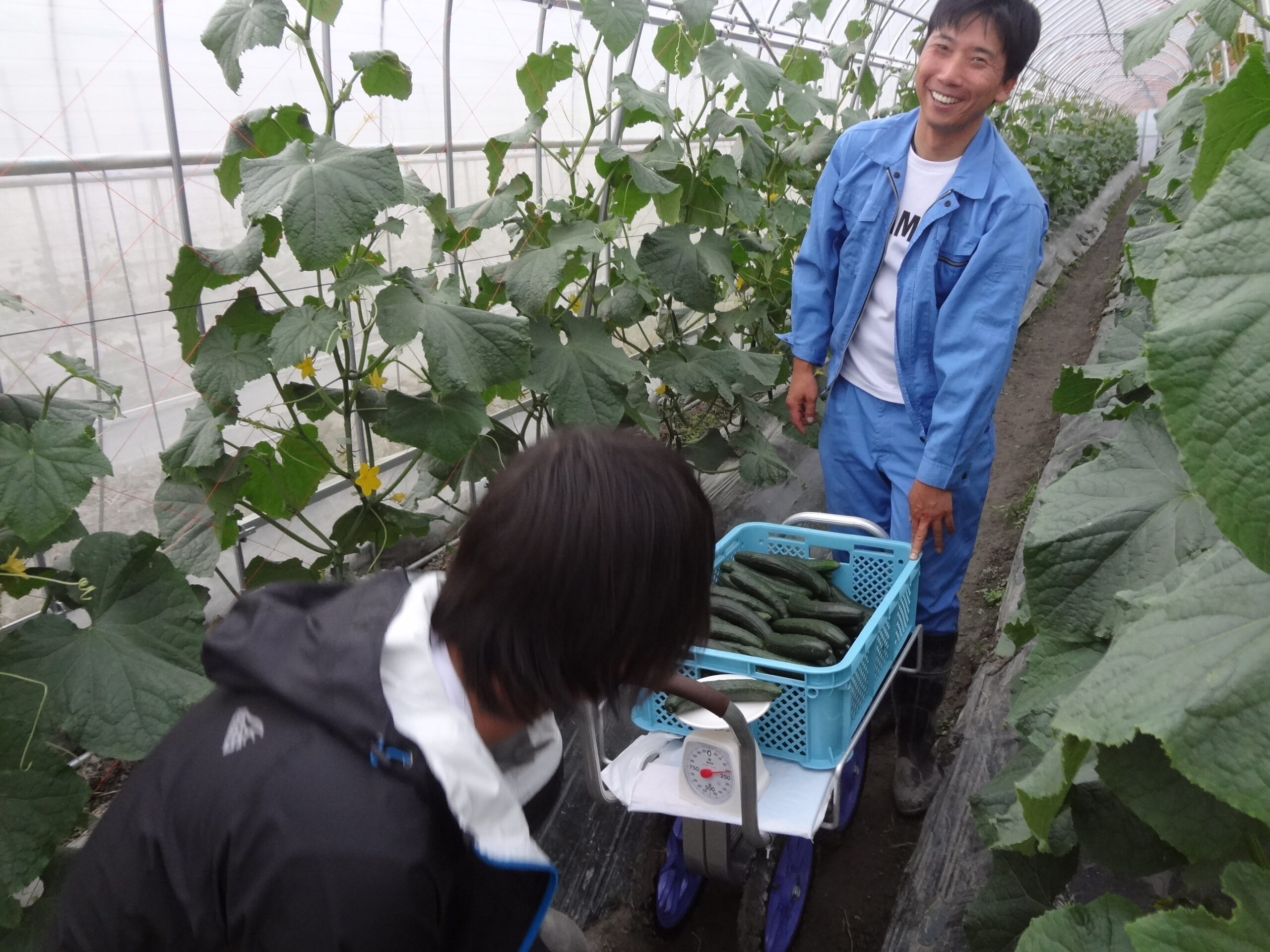 5/14に定植したハウスでは、もう背丈に迫る勢いできゅうりの樹が成長しています。その中から収穫適期のきゅうりを見つけて鋏で収穫していきます。収穫適期かどうかをぱっと見分けられるようになるには、「ただひたすら経験を積むこと」と指導マネージャーからアドバイスがありましたが、今は当然悩みながらの収穫です。