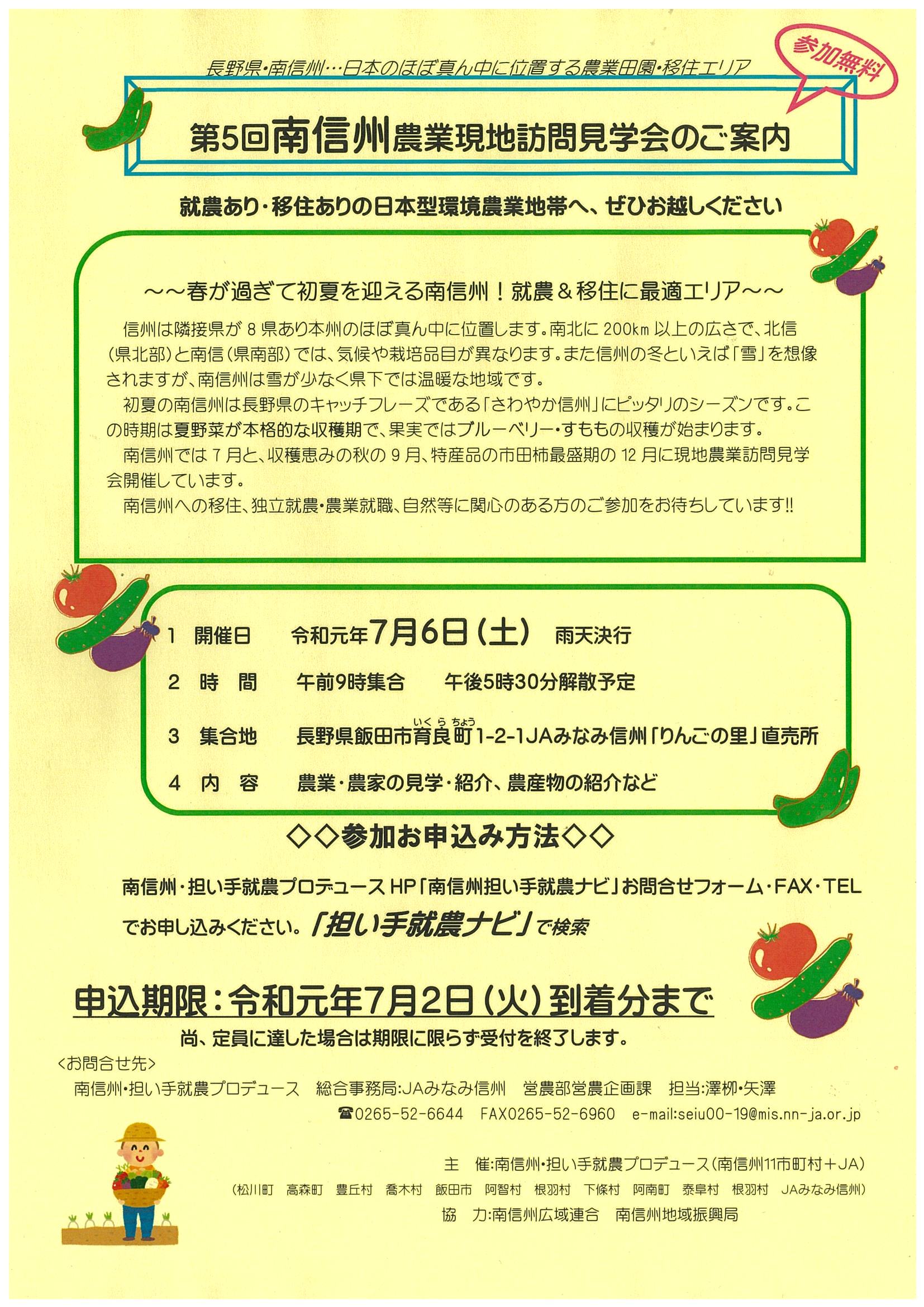 6月62019お知らせ今年もやります!!!南信州への移住・就農に興味のある方、この機会に一度南信州に来てみませんか?? 夏の南信州を見て・触れて・食べて♪♪♪美味しいランチとお土産をご用意して、お待ちしています。 参加申込書はこちら 開催要領はこちら Category: お知らせ2019年6月6日Post navigationPreviousPrevious post:今週末から3週連続出展!!東京&名古屋就農・移住相談会のご案内NextNext post:きゅうり初収穫関連記事【予告】2月東京開催 移住就農相談会 開催します💁2025年12月19日令和8年度 研修第9期生 募集のお知らせ2025年11月21日≪予告≫ 南信州担い手就農研修制度 第9期生募集について2025年10月31日南信州農業 現地訪問見学会を開催します💁🍎2025年10月27日📅今後の相談会情報🍎2025年10月3日【泰阜村】第29回 全国小さくても輝く自治体フォーラムin泰阜村が開催されます【5/15(木)16(金)】2025年4月15日