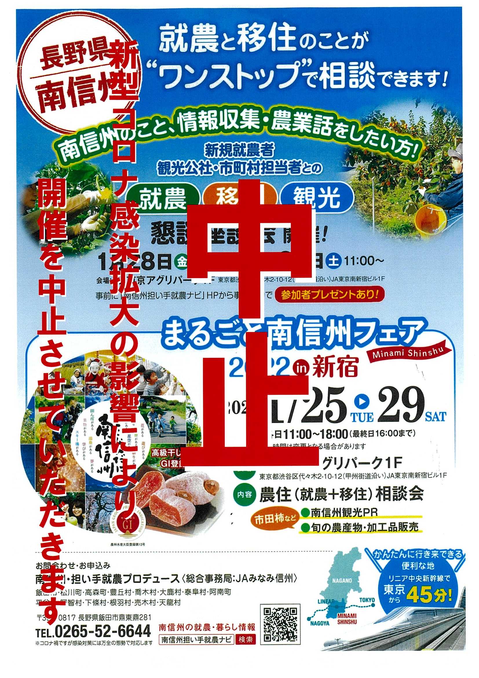 市田柿や加工品の購入を楽しみにされていた皆様や、「南信州」への「移住・就農・観光」の相談を予定されていた皆様には心苦しく、私たちとしても大変残念に思っております。