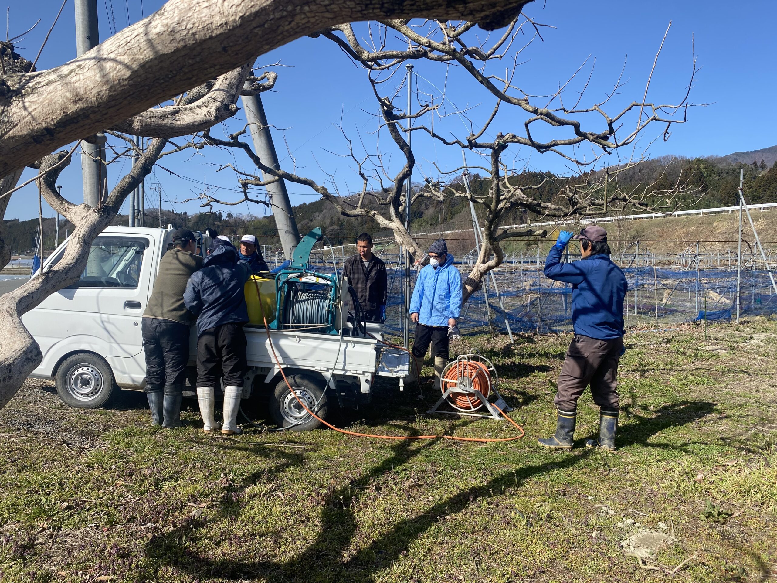 市田柿の研修圃場の新シーズン初回防除をおこないました!
