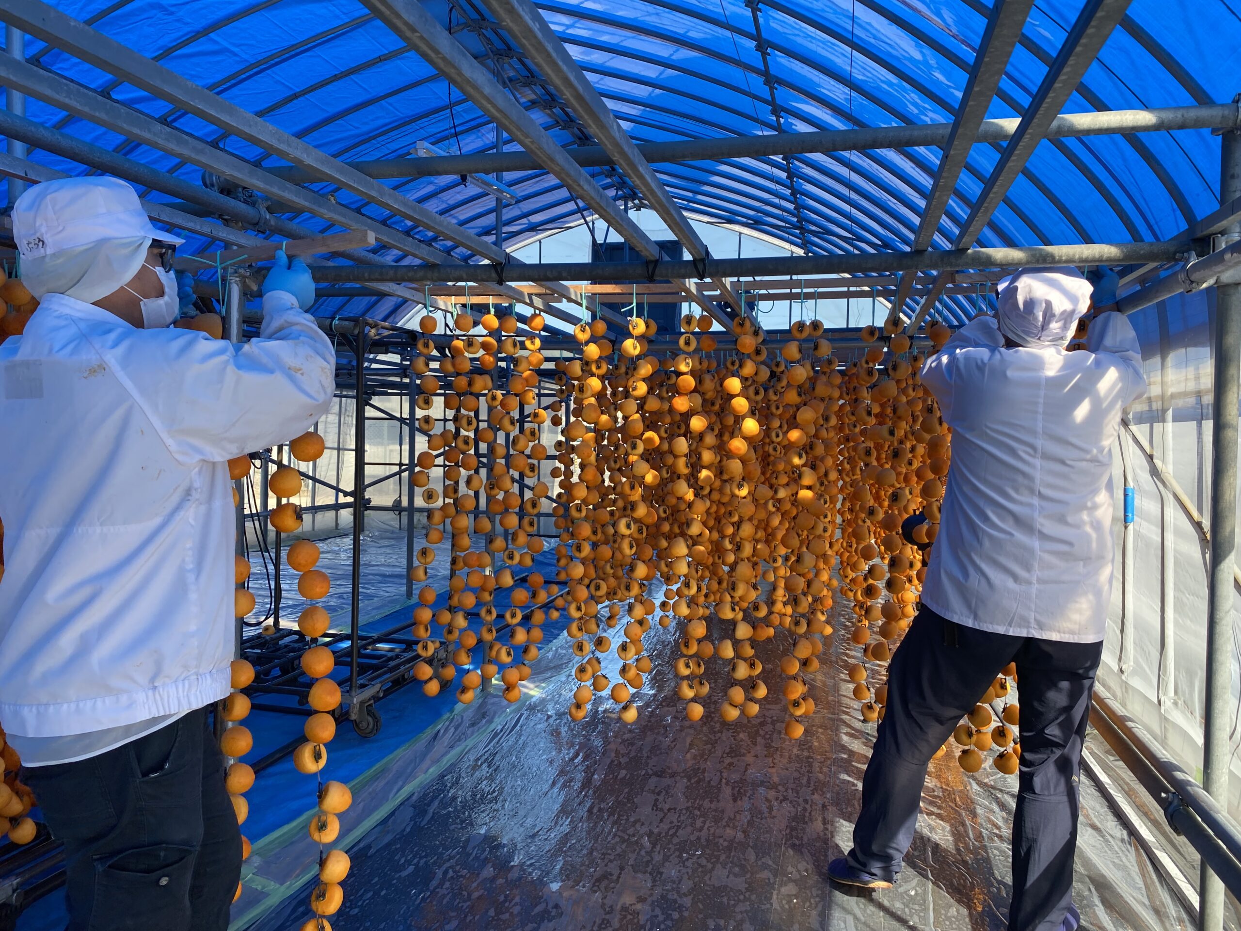 先週市田柿の皮むきが終了し、一番最初に皮むきをしたロッドははざ下ろし目前まで干しあがってきています。