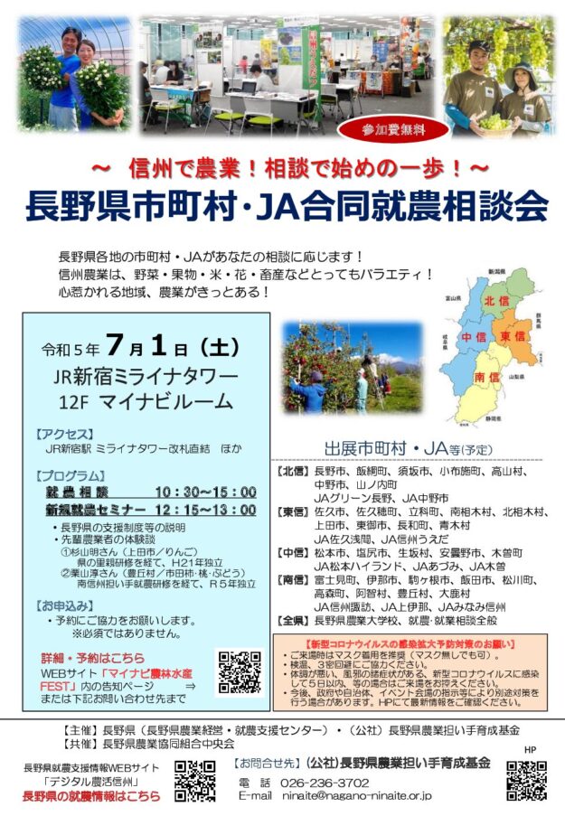 長野県市町村・JA合同就農相談会が開催されます! R5市町村・JA合同就農相談会チラシ 長野県内各地より30ブースが出展します。 「農業って?」「長野県って?」 と、興味がある方ぜひお気軽にお越しください。 ↑ 昨年度の…