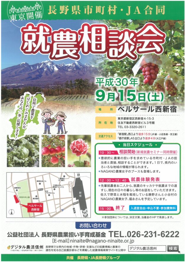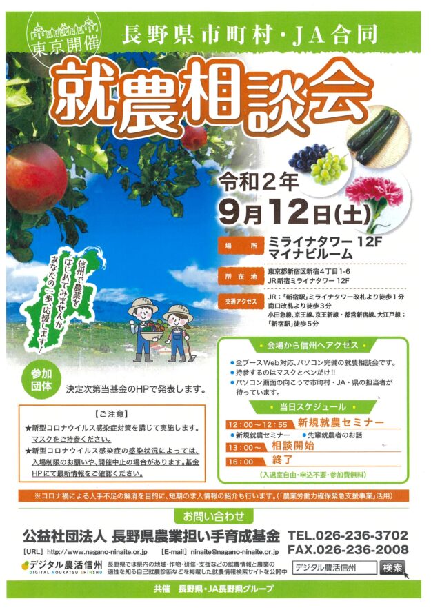 明日9月15日(土)は、西新宿にて「長野県市町村・JA合同就農相談会」が開催されます。 農業人フェア等とは違い、長野県独自の就農相談会です。県内各地から約30の市町村・JA等のブースが出展されます。南信州・担い手就農プロ…
