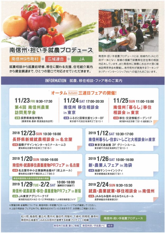 今後の就農相談会出展予定、南信州への移住相談・フェアのスケジュールをご案内します。大勢の方のご来場をお待ちしています。 特に、年明け1月29日(火)~2月2日(土)、東京都新宿区「JA東京アグリパーク」にて、南信州での就…