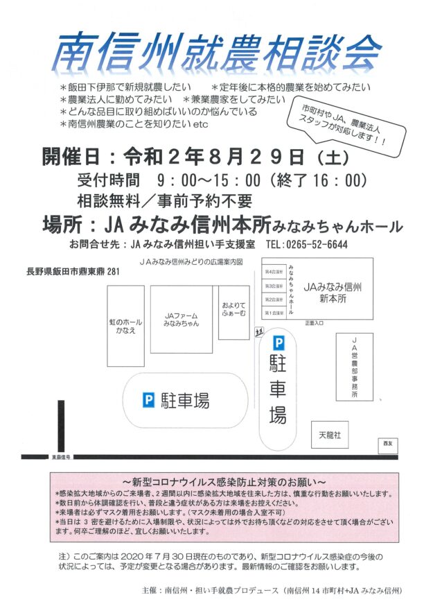 地元である長野県飯田市にて就農相談会を開催します。 当日は市町村やJAのスタッフが対応いたします。農業に関する情報収集、どんな品目が儲かる?など、今後農業をやってみたいなという方はぜひお出かけください。 注意)本告知は7…