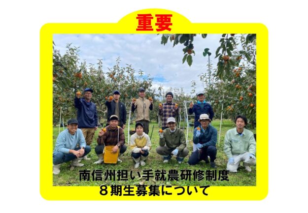 ≪予告≫ 南信州担い手就農研修制度 第8期生の募集を11月22日(金)から開始いたします。 11月22日(金)に南信州担い手就農ナビのホームページにて募集の詳細を公開いたします。 募集についてのお問い合わせはホームページ…