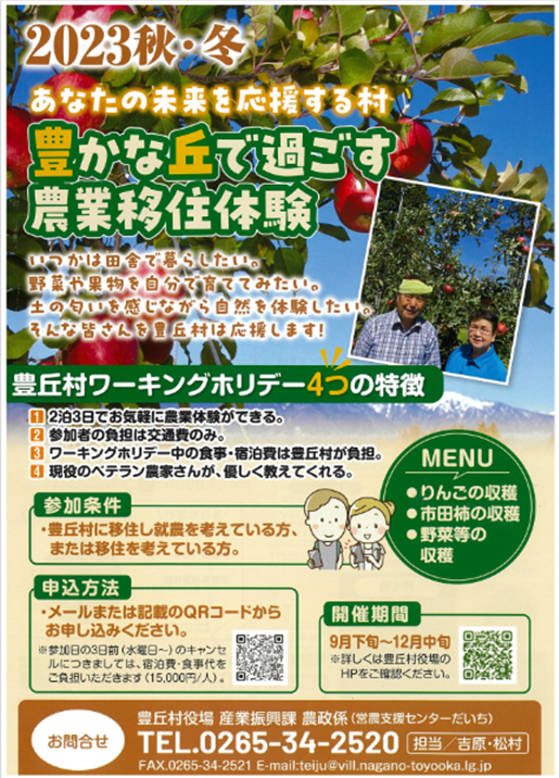 ※受付終了しました 【豊丘村よりお知らせ】 あなたの未来を応援する村 豊かな丘で過ごす 農業移住体験 9月より始まっているワーキングホリデーですが、まだまだお申し込みを受け付けています。 豊丘村に本気で移住…