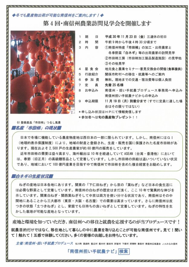 南信州への就農・移住相談会&農畜産物大試食会・販売会&地域の情報発信PRイベント開催!! 14の市町村からなる南信州地域(飯田市+下伊那郡)は長野県の南端に位置する、県内でも温暖で雪の少ない地域。今回この南信州地域の市町…