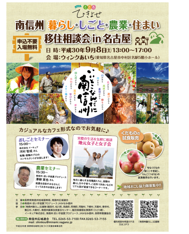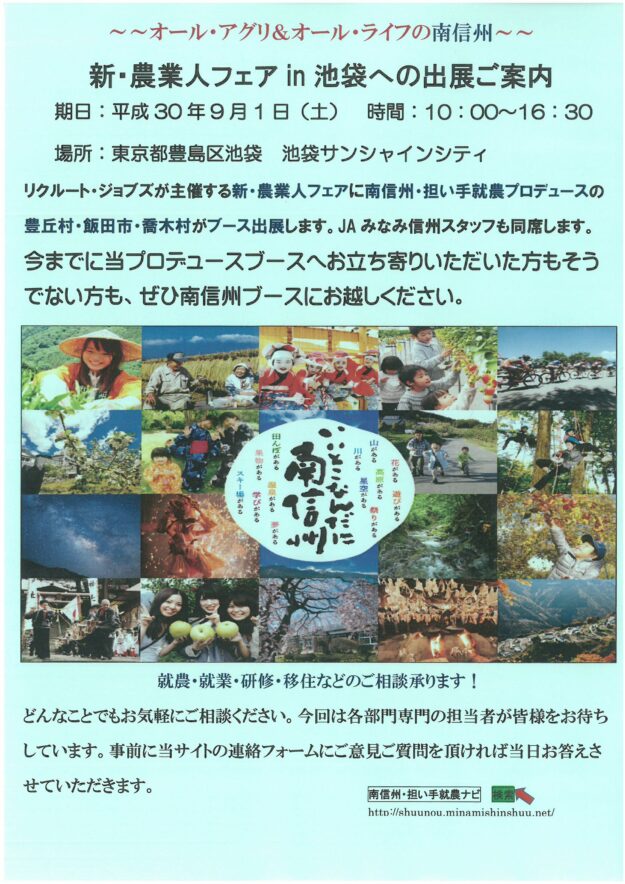 飯田市(ブース123)・豊丘村(ブース83)・喬木村(ブース87) が出展します。ぜひお立ち寄りください。 開催日:平成30年9月1日(土) 受付時間:10:00~16:00 場 所:池袋サンシャインシティBホール(4F…