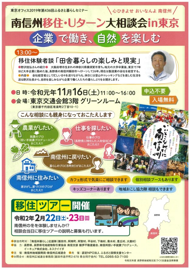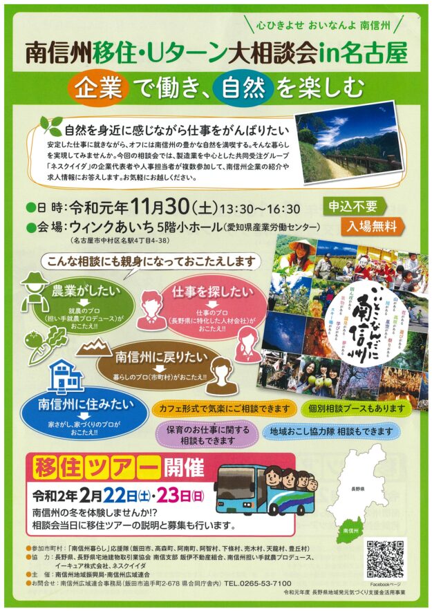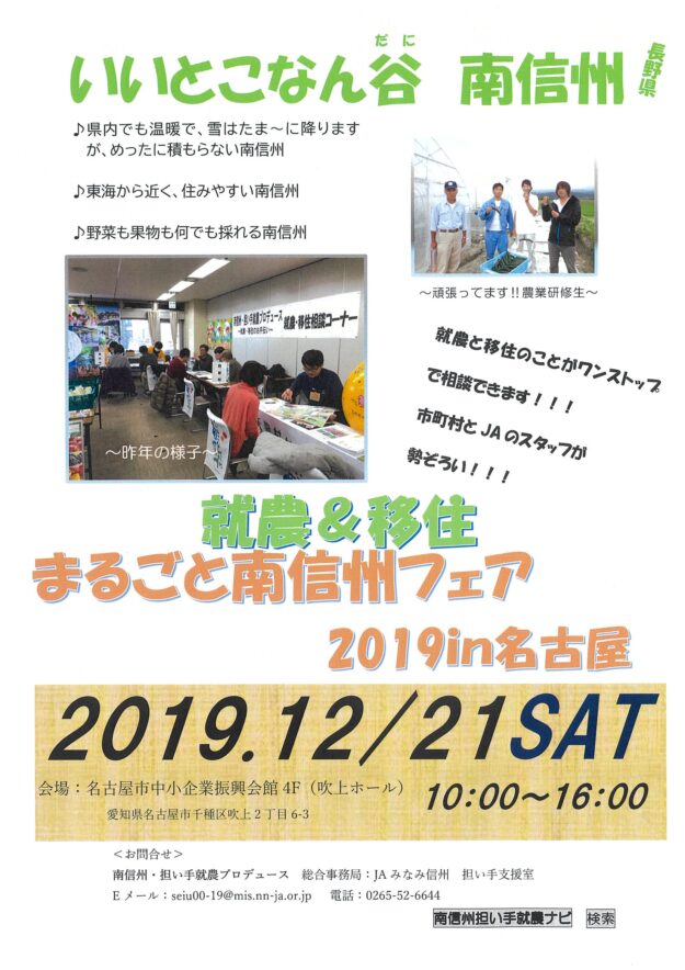 南信州への移住、就農をお考えの方、ぜひお越しください。 南信州の各市町村スタッフ、JAのスタッフが皆様のご相談に対応させて頂きます。 まずは南信州に関する情報収集、気になる色々なこと、スタッフとお話することでイメージをつ…