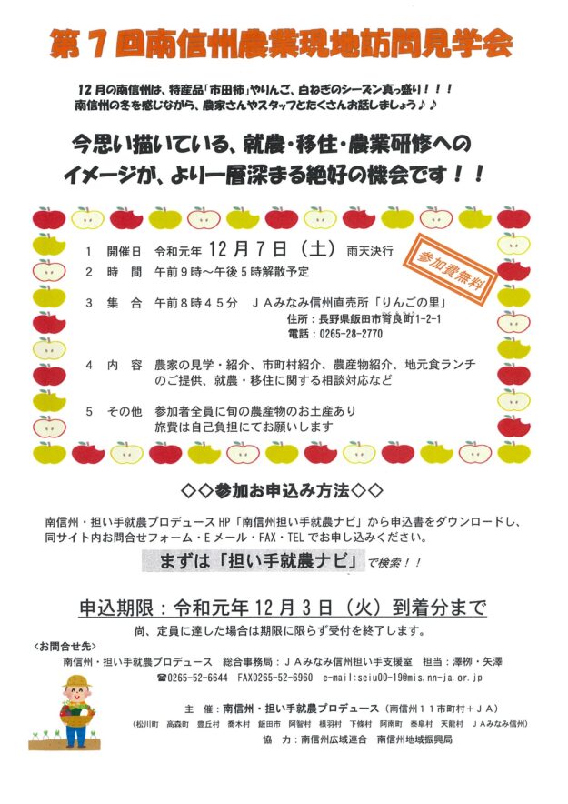 南信州・担い手就農プロデュース(以下「プロデュース」という)企画による「南信州担い手就農研修制度」では、令和2年度の研修生を下記のように募集します。採用については、原則としてプロデュース参画市町村が実施する「地域おこし協…