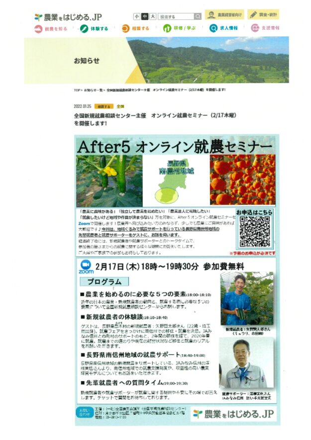 2月17日(木)の全国新規就農相談センター主催オンライン就農セミナー(アフター5就農セミナー)は、私たち「南信州担い手プロデュース」の回になります。 南信州からは、 南信州担い手研修制度第1期生で、研修修了後には下伊那郡…