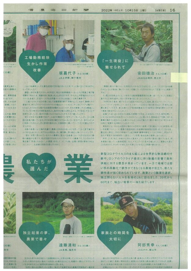 JA長野中央会による長野県内新規就農者取材があり、JAみなみ信州からは当研修制度修了者(第2期生)で就農2年目の安田徳治氏(豊丘村)が取材を受けました。 10/15(土)「信濃毎日新聞」では、特に就農を目指した当時の様子…