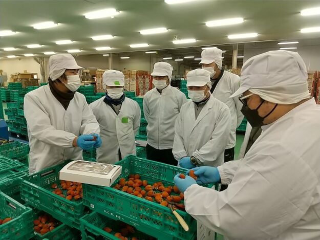 乾燥管理を続けてきた市田柿は、 ①柿の重量が35%程度になる ②表面にうっすら縦ジワが現れる ③果肉が羊羹状に固まる と乾燥終了の目安で「ハザおろし」を行い、継続してホゾ(果梗)切り作業と軟らかさごとの選別作業を行います…