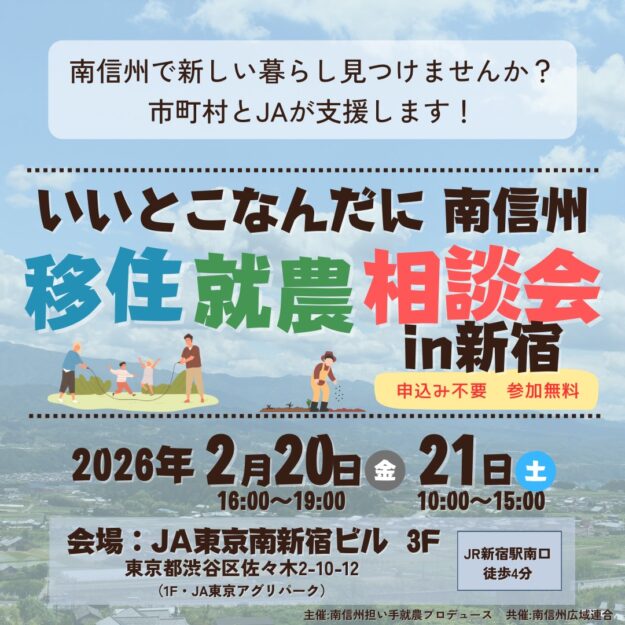 【2月東京開催】 移住就農相談会 開催します💁※1/19情報更新 お知らせ, 就農相談By スタッフ2025年12月19日\ 開催決定❗ / ※1/19情報更新 いいとこなんだに南信州 移住就農相談会 📅日時:2026年2月20日(金) 16:00~19:00 2月21日(土) 10:00~15:00 📍会場:JA東京南新…